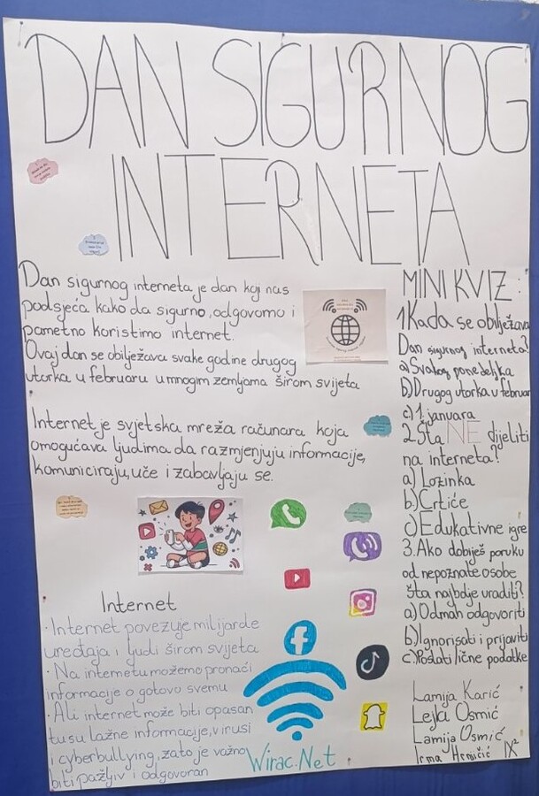 Učenici VI, VII, VIII i IX razreda učestvovali su i u online kvizu povodom Dana sigurnog interneta, objavljenom na Facebook stranici „Sigurno dijete“.